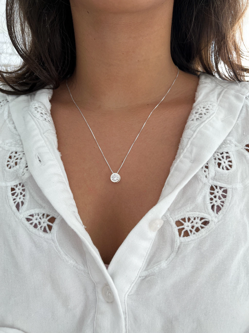 Collar con cadena muy fina y dije cubic redondo chico. Delicado con borde y cubic brilloso en el centro.