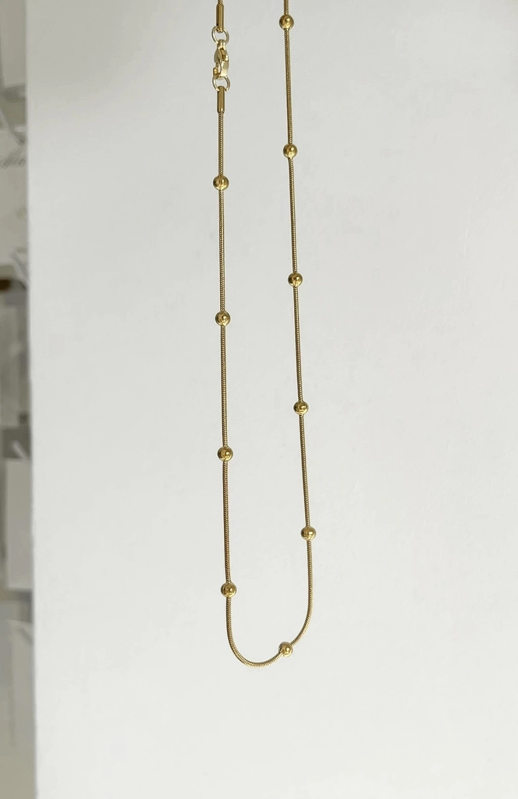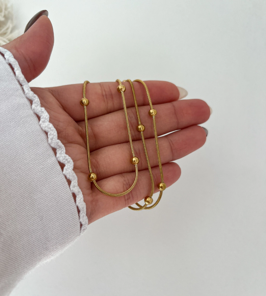 Sumá un toque de elegancia a tu estilo con nuestro collar con bolitas, fabricado en acero quirúrgico de alta calidad con baño dorado. Este collar es perfecto para cualquier ocasión, combinando un diseño minimalista con la resistencia y durabilidad.
