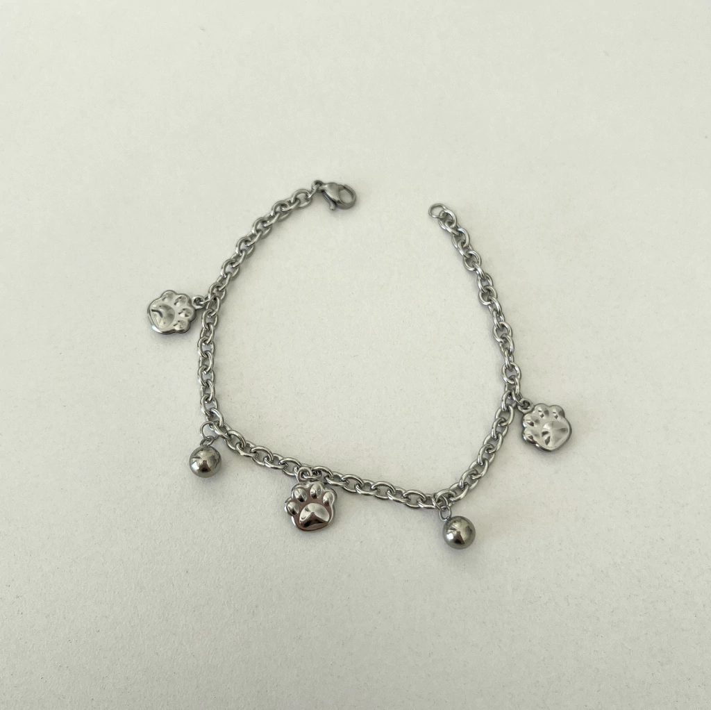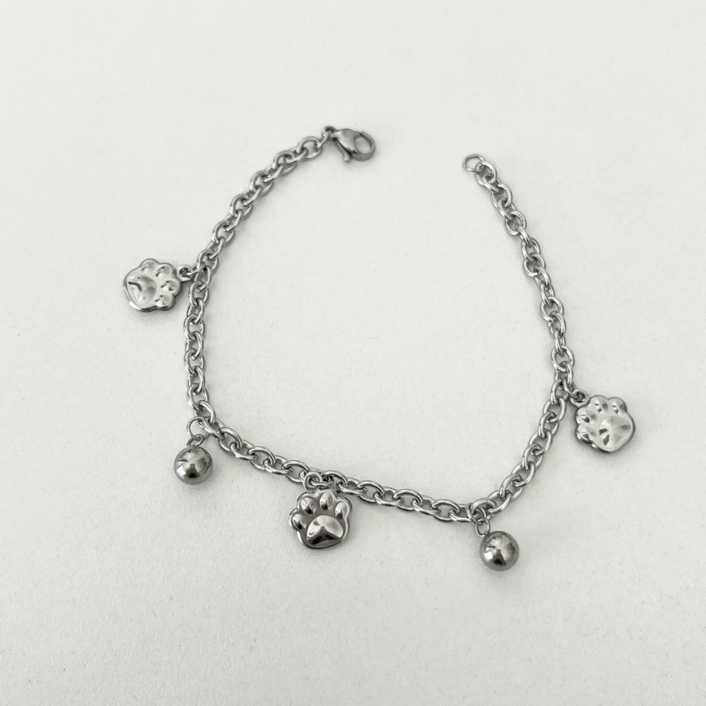 La pulsera de acero quirúrgico con dijes de huellitas es ideal para quienes sienten una conexión especial con sus mascotas. Delicada, moderna y super combinable, se luce sola o acompañada de otras pulseras.